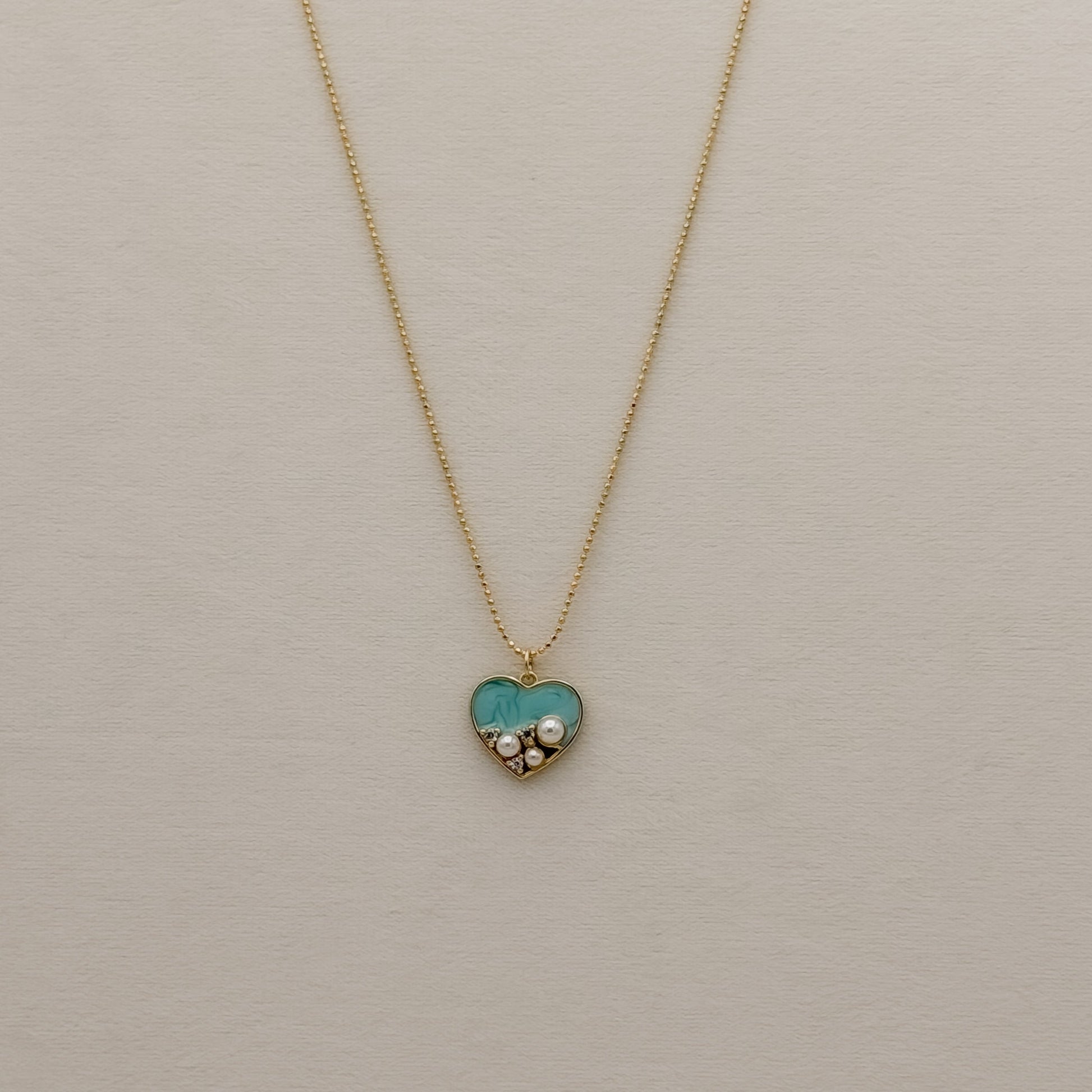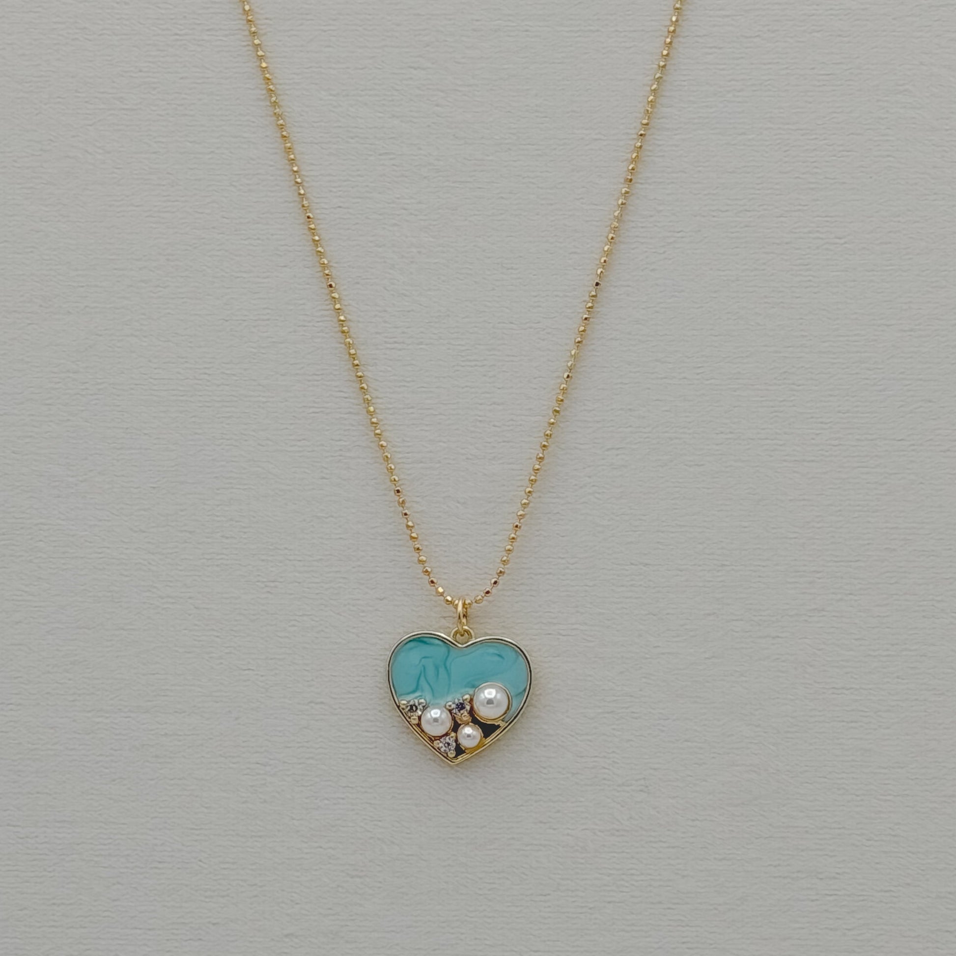 Dainty beaded ball chain finished with a vibrant turquoise and pearl abstract heart pendant.